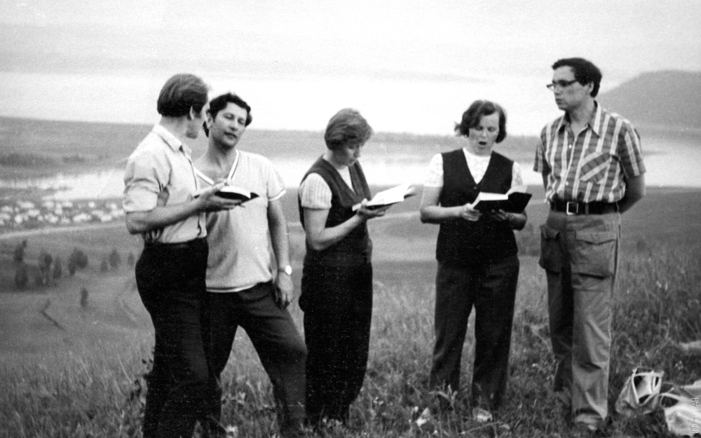 Группа сотрудников Института физики им. Л.В. Киренского Сибирского отделения Академии наук СССР, занимавшаяся изучением английского языка, на так называемом «погружении», в поселке Приморск Красноярского края, на горе «Любви». Вдали - Красноярское море. Слева направо: Зеер Э.П., Бержанский В.Н., Садовская Г.М., Зайцева М.П., Спиров В.В., фото: июнь 1973 года.