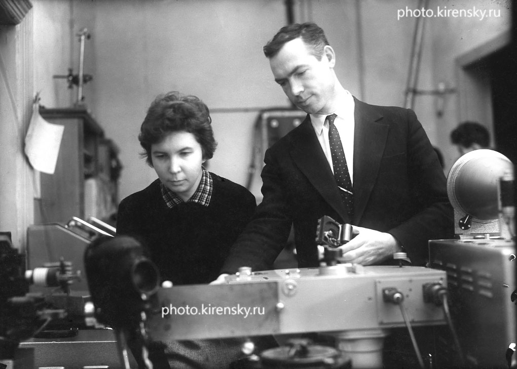 1966 год. Младший научный сотрудник Зыкова Н.М. и Золотухин Г.Е., заведующий лабораторией эмиссионной спектроскопии Института физики Сибирского отделения Академии наук СССР (ИФ СО АН СССР) (СО АН СССР с 1991 года СО РАН), около опытной установки по изучению динамики интенсивности свечения электродных пятен. Красноярск.