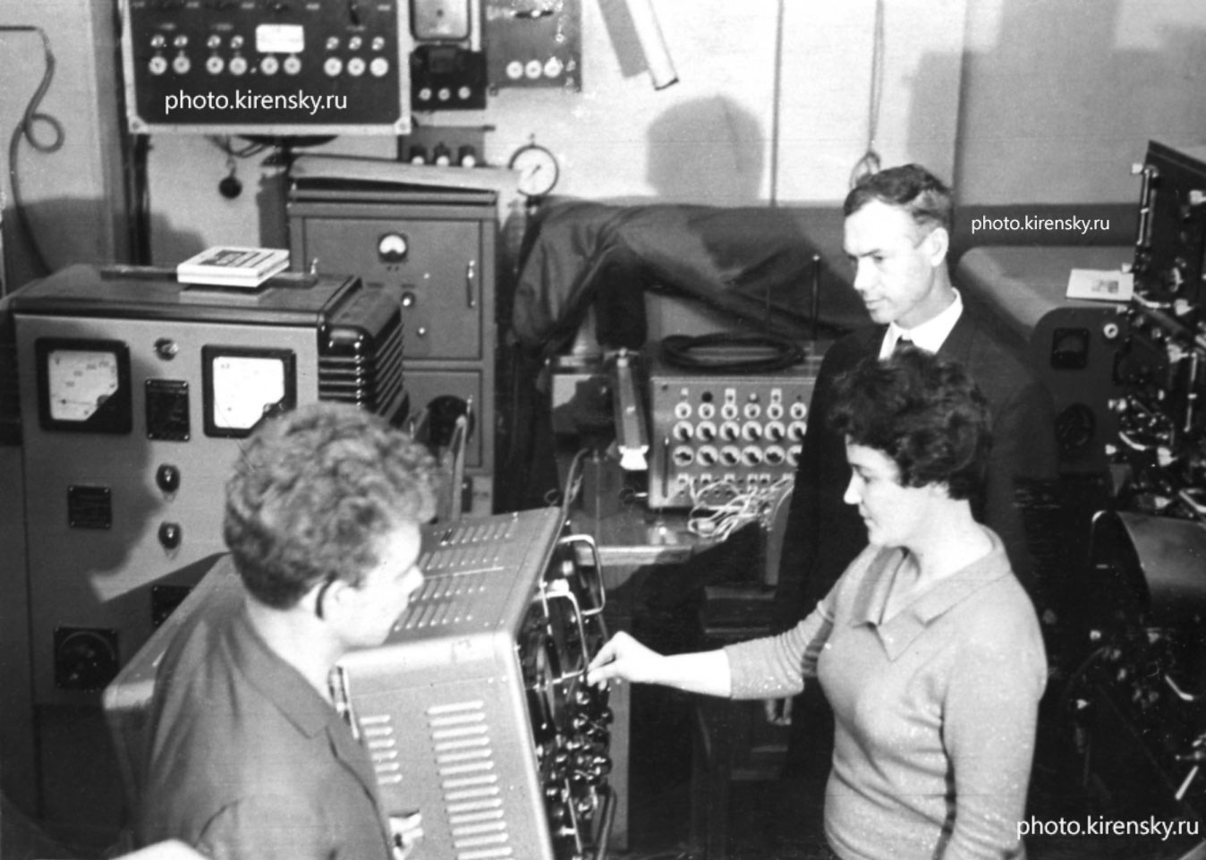 1967 год. Т.Ф. Зыкова и А.П. Устимец, сотрудники лаборатории эмиссионной спектроскопии Института физики Сибирского отделения Академии наук СССР (ИФ СО АН СССР), за установкой по исследованию состава поверхностных пленок методом спектрального анализа. Красноярск.