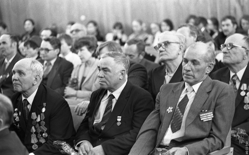 1985 год. Конференц-зал Института физики им. Л.В. Киренского Сибирского отделения Академии наук СССР (ИФ СО АН СССР). Идет торжественное заседание в честь 40-летия Победы в Великой Отечественной войне (1941-1945 гг.). На переднем плане: Кушнаренко Виктор Андреевич (крайний справа), рядом с ним Зырянов Гаврила Иванович.