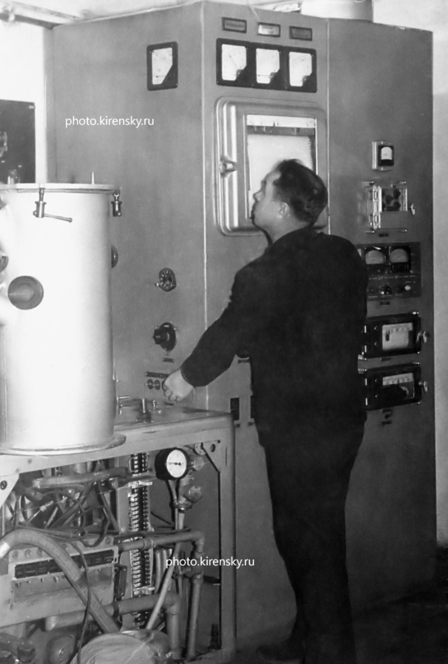 Зырянов Гаврила Иванович, старший инженер лаборатории магнитных материалов Института физики Сибирского отделения Академии наук СССР (ИФ СО АН СССР), специалист в области технологий для изготовления поли- и монокристаллических ферритов, за одной из установок для выращивания монокристаллических ферритов, фото 1962 года.