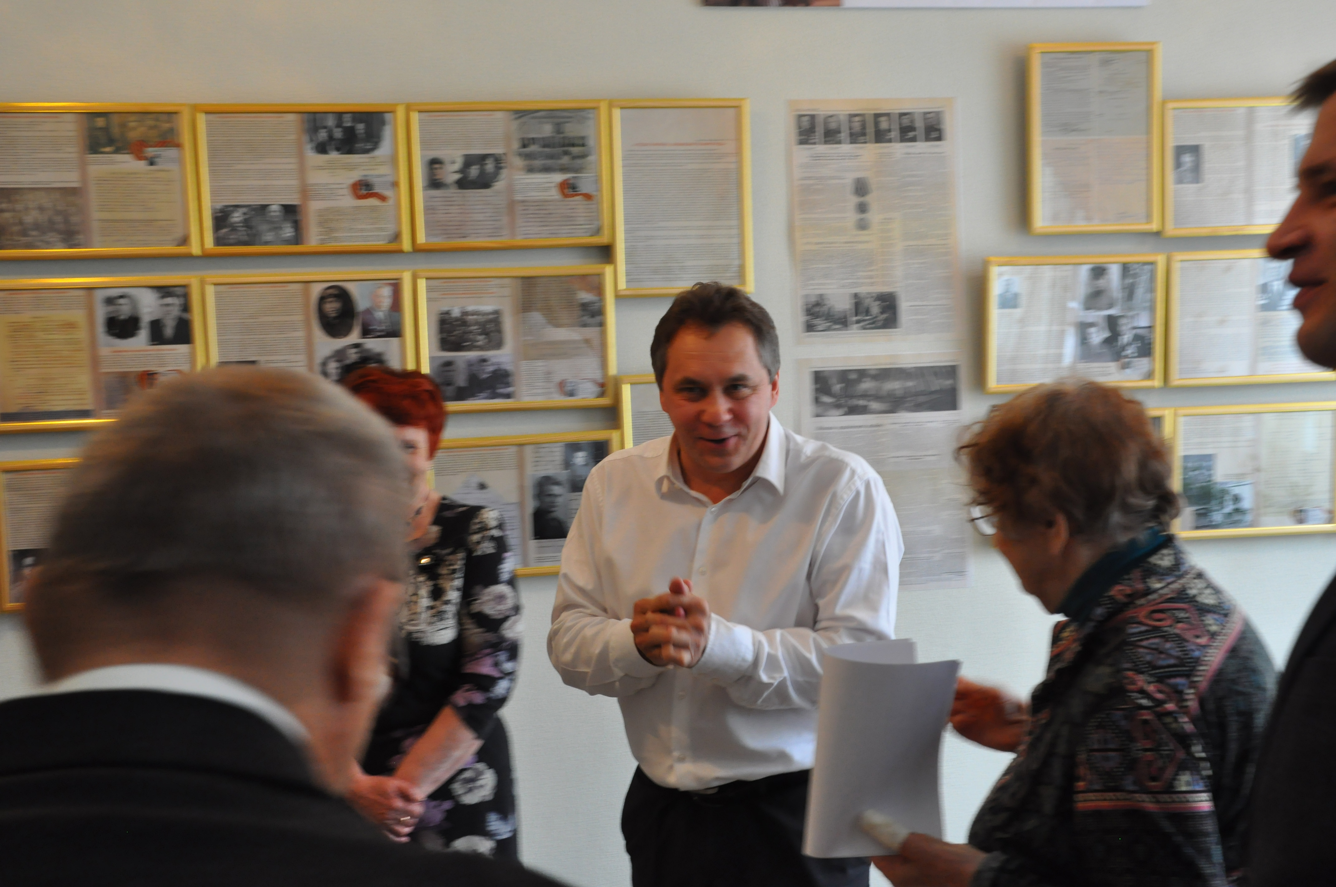2015 год, 8 мая. На открытии стенда «Живем и помним…», посвященного 70-летию Победы в Великой Отечественной войне (1941-1945 гг.). В центре директор Института физики им. Л.В. Киренского Сибирского отделения Российской академии наук (ИФ СО РАН) Волков Никита Валентинович.