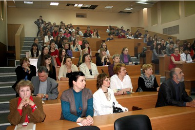 Внимательно слушали тех, кто выступал в аудитории Сибирского федерального университета на открытии памятного барельефа, посвященного Л.В. Киренскому, студенты, преподаватели и гости. Красноярск 25 мая 2012 год.