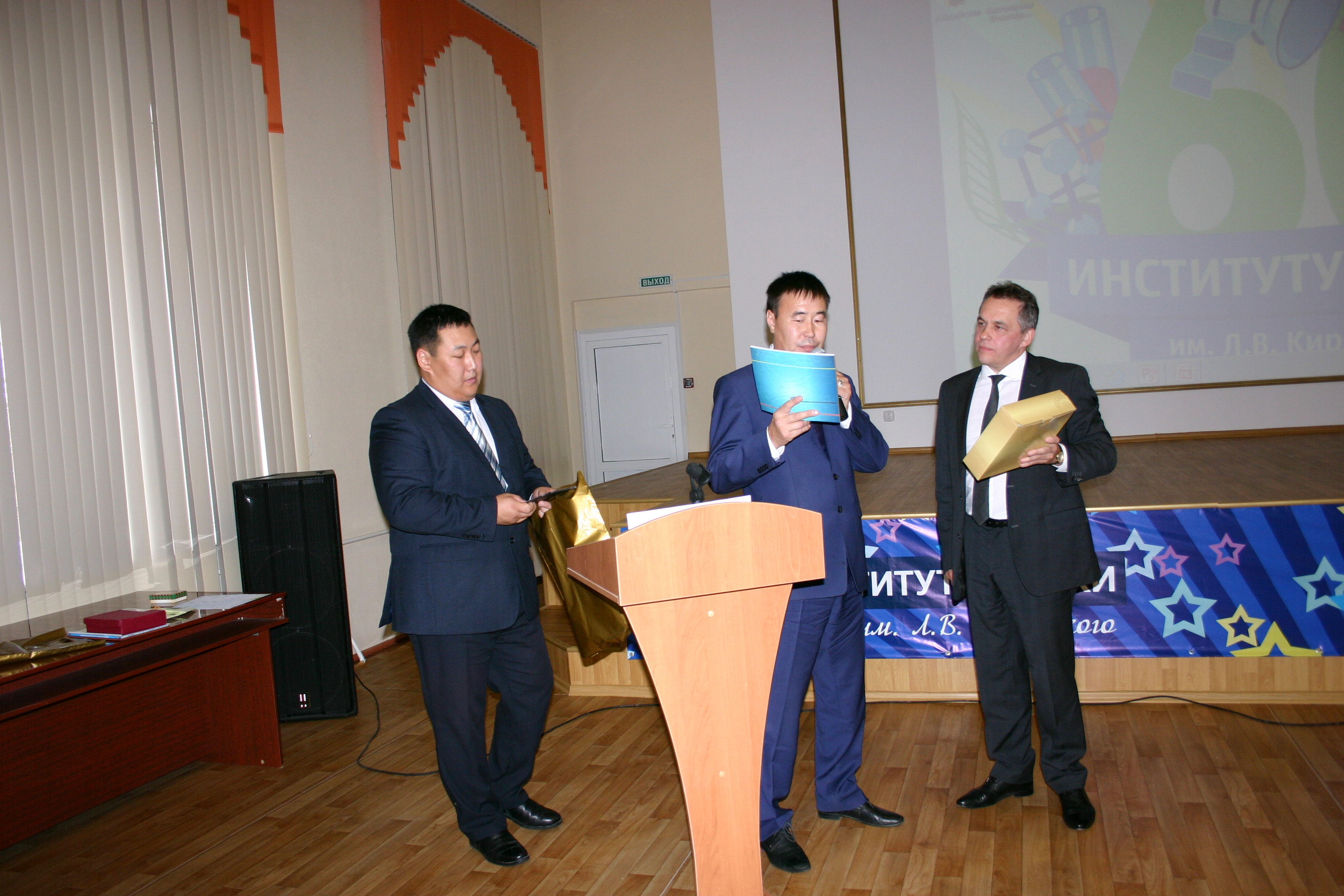 12 октября 2016 года в конференц-зале Института физики им. Л.В. Киренского Сибирского отделения Российской академии наук (ИФ СО РАН) проходило расширенное заседание ученого Совета, посвященное 60-летию образования института с участием сотрудников института, представителей администраций города и края, директоров предприятий-партнеров, директоров подразделений ФИЦ КНЦ СО РАН и других гостей. Директор ИФ СО РАН Волков Н.В. принимает поздравления от гостей из Амгинского улуса (село Амга в Якутии является малой Родиной Л.В. Киренского, организатора и первого директора Института физики). Слева направо: Ю.Е. Шишигин, начальник управления образования Амгинского улуса; П.И. Лебедев, первый заместитель главы администрации Амгинского улуса Республика Саха (Якутия). Красноярск.