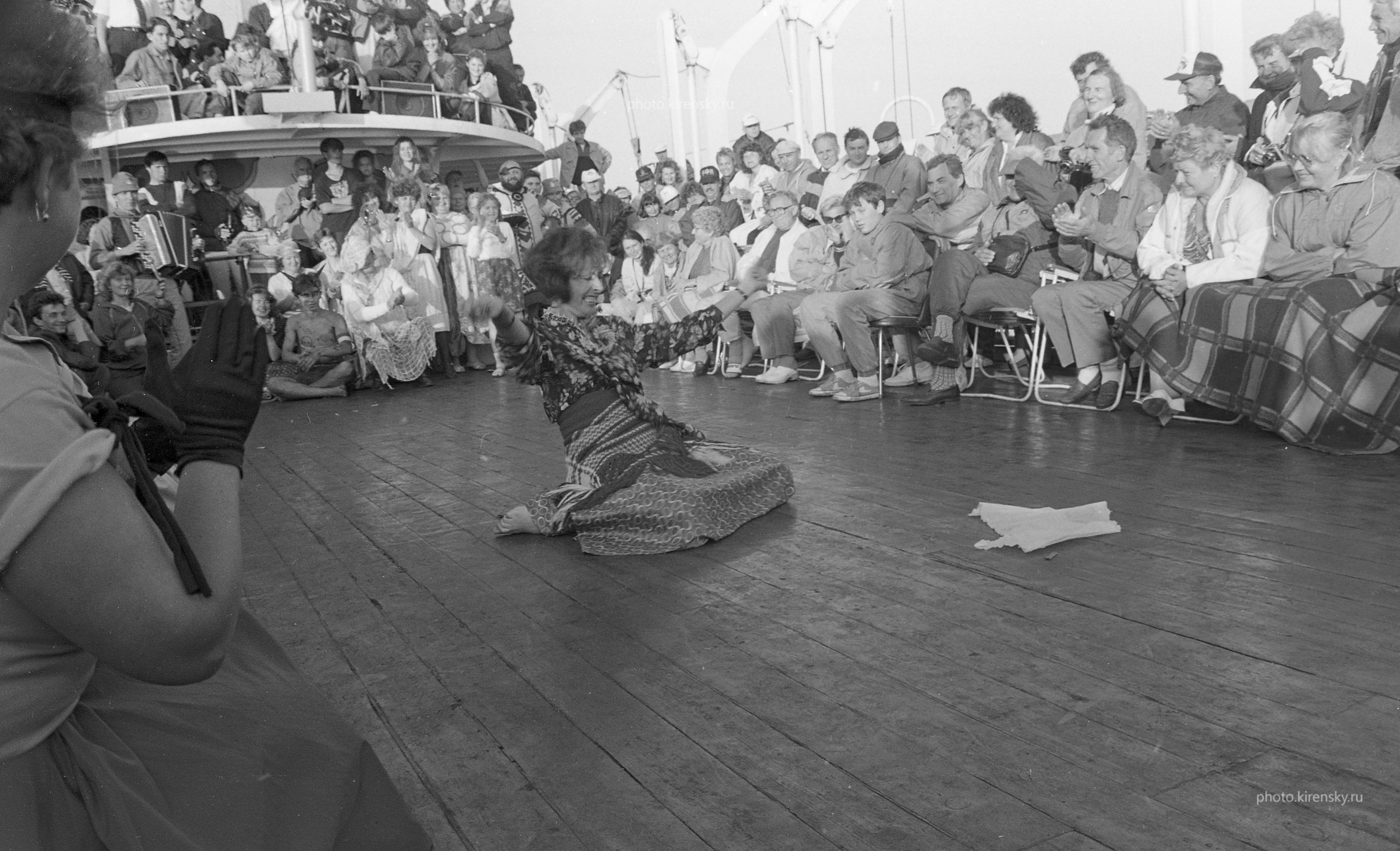 С 1 по 10 июля 1992 года на теплоходе «А. Матросов» (рейс Красноярск – Дудинка - Красноярск) проходила Международная конференция по магнитоэлектронике, организованная Институтом физики им. Л.В. Киренского Сибирского отделения Российской академии наук (ИФ СО РАН). На снимке вечерний отдых участников конференции. Танцует Саклакова Н.П., сотрудник Института физики, лаборатория резонансных свойств магнитоупорядоченных веществ.