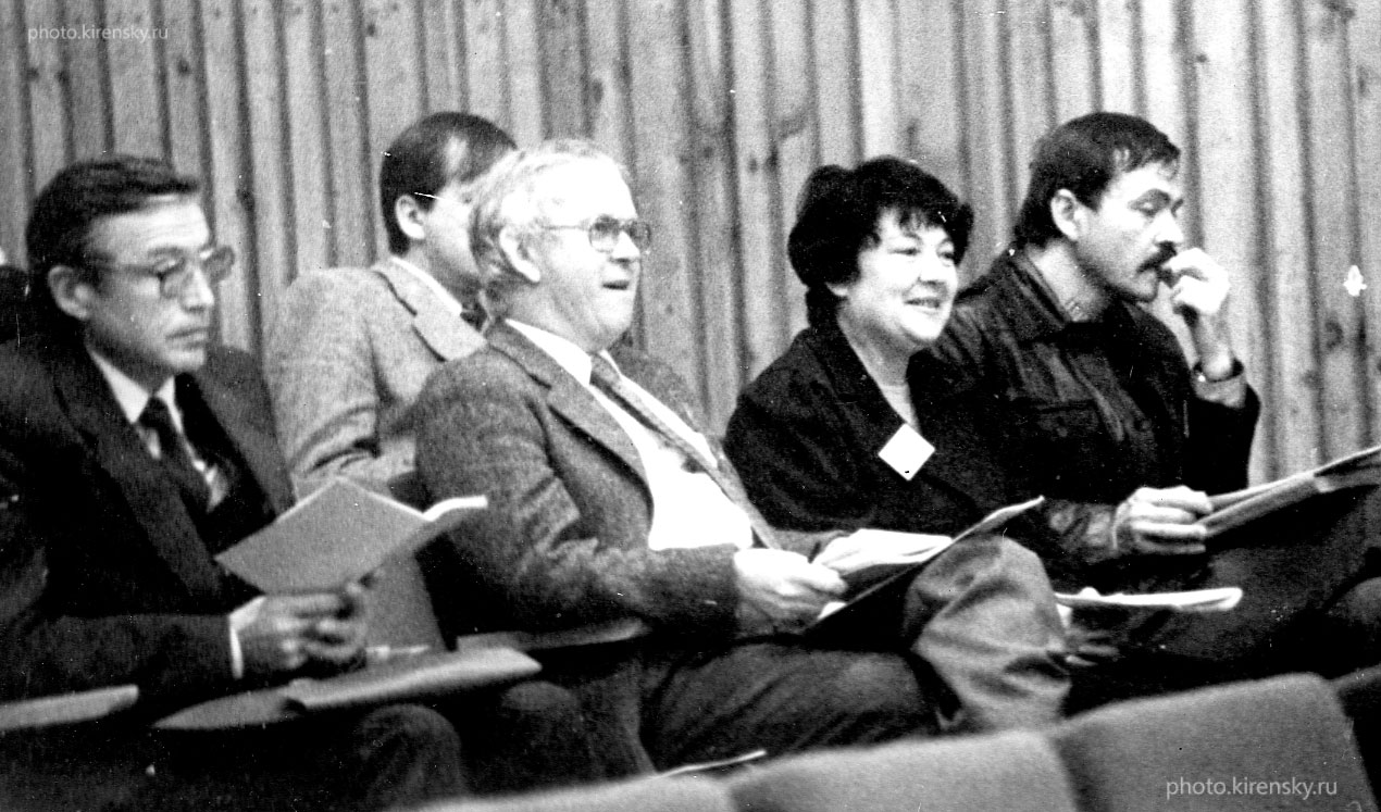 Александрова И.П., заведующая лабораторией кинетических процессов Института физики им. Л.В. Киренского Сибирского отделения Академии наук СССР (ИФ СО АН СССР) и Армстронг Р.Л. ученый Канады (второй слева), на Международном симпозиуме-спутнике по ядерно-магнитному резонансу (ЯМР). Пленарное заседание. Симпозиум был организован и проведен Институтом физики с 28 по 30 сентября 1987 года в поселке Шушенское Красноярского края.
