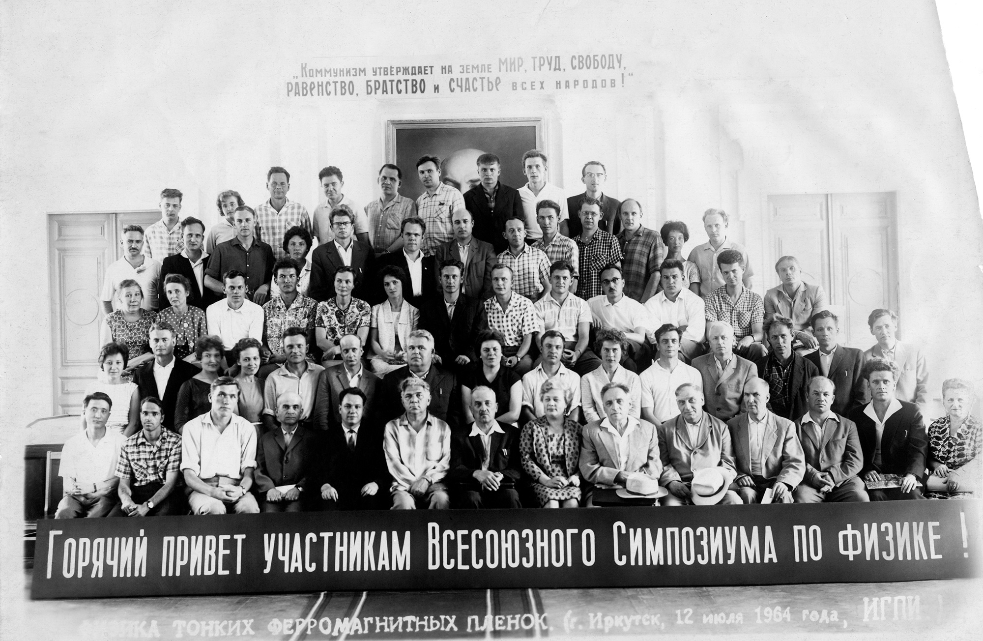 Фото на память участников Всесоюзного симпозиума по физике тонких ферромагнитных пленок, организованного Институтом физики Сибирского отделения Академии наук СССР (ИФ СО АН СССР) и Иркутским государственным пединститутом в Иркутске в июле 1964 года.