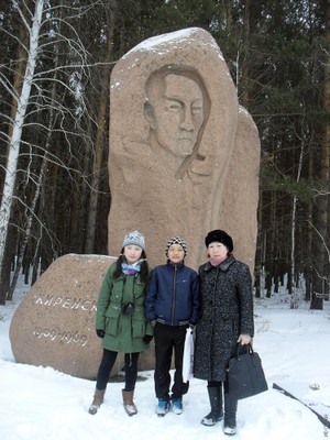 Слева направо: Степанова Оля, Соломонова Мария, Птицын Виталий на фоне главного корпуса института. На здании горильеф С.П. Королева, выполненный известными скульпторами Н.А. Силисом и В.С. Лемпортом, творчество которых очень ценил Л.В. Киренский, поэтому памятник на могилу Леонида Васильевича был заказан этим скульпторам и еще в изготовлении его участвовал скульптор Л.В. Соколов.