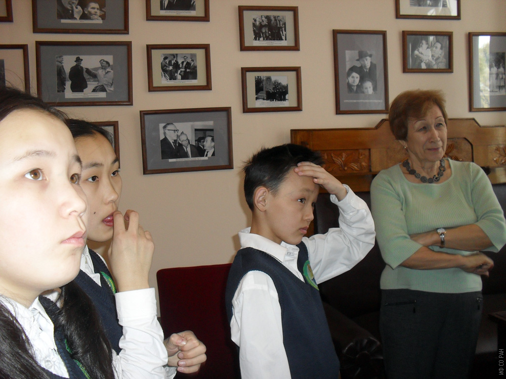 2013 год. Профессор Ирина Самсоновна Эдельман проводит экскурсию в мемориальном музее Л.В. Киренского, организатора и первого директора Института физики Сибирского отделения Российской академии наук для школьников из Амги (Якутия), малой родины академика Киренского. Ребята заинтересованно рассматривают экспонаты музея. Красноярск.