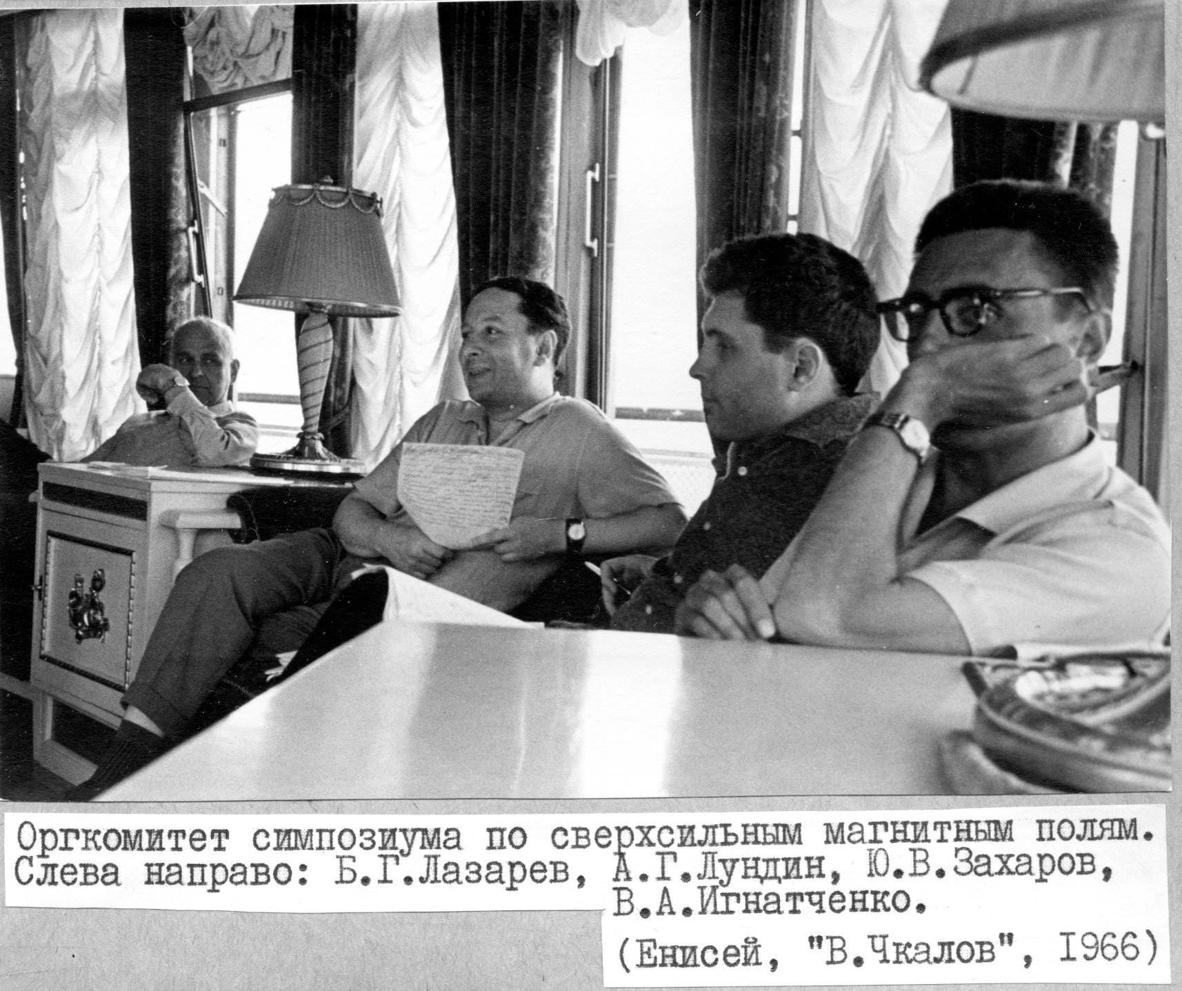 В 1966 году Институт физики Сибирского отделения Академии наук СССР организовал и провел Всесоюзный симпозиум по сверхсильным магнитным полям. Симпозиум был проведен на теплоходе «В. Чкалов» рейс Красноярск – Дудинка –Красноярск. На снимке члены оргкомитета симпозиума, слева направо: Б.Г. Лазарев, А.Г. Лундин, Ю.В. Захаров, В.А. Игнатченко.