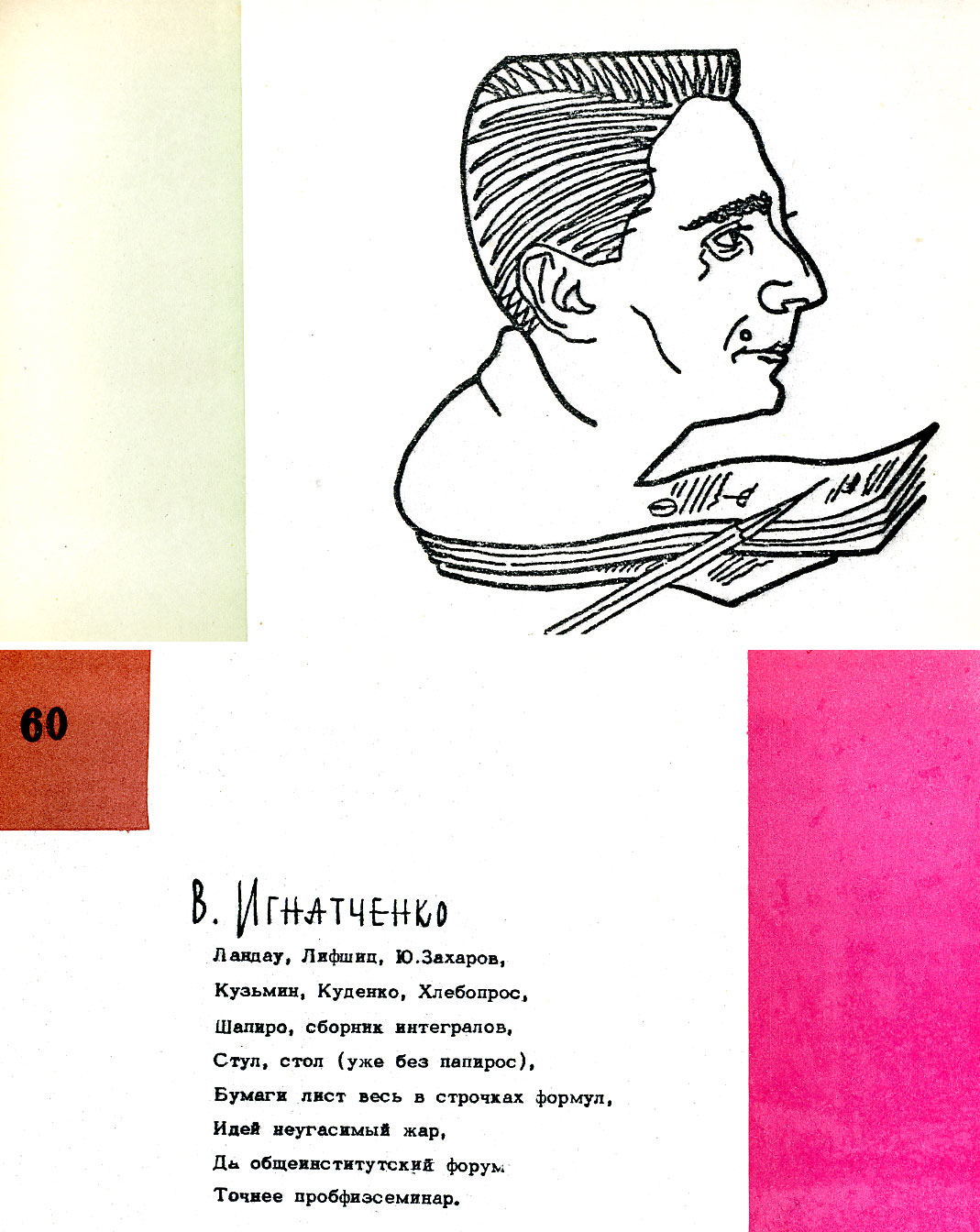 Дружеский шарж Игнатченко В.А. из книги "Музей друзей", изданной научными сотрудниками Института физики Сибирского отделения Академии наук СССР (ИФ СО АН СССР) Олегом Артемьевичем Баюковым и Николаем Сергеевичем Чистяковым. Удивительная книжка дружеских шаржей и эпиграмм на сотрудников Института физики СО АН СССР. Она вышла в 1967 году к 10-летию начала работы института. Вышла небольшим тиражом в 100 экземпляров и распространялась строго по списку, лично в руки. Узнать себя на страницах книги смогли 48 самых ярких и заметных личностей молодого института. Позже (в 1971 году) вышла вторая книга под таким же названием. Что побудило их взяться за такой труд, авторы подробно изложили в предисловии к первой и второй книгам. Книги размещены на сайте.